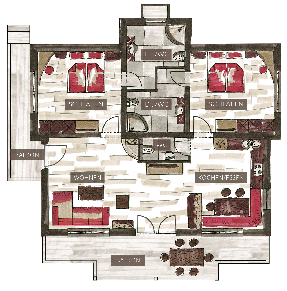 Das Appartement Typ 2 befindet sich im 1 Obergeschoss und verfügt über 2 Schlafzimmer mit Doppelbett (aus Massivholz), Flat-TV und jeweils eigenem Badezimmer. Die geräumigen Badezimmer sind mit Dusche, WC, Haarfön und Kosmetikspiegel ausgestattet. Der großzügige Kochbereich mit Essecke verfügt über Ceranfeld, eingebaute Mikrowelle, Kühl-/Gefrierschrank, Geschirrspüler, Kaffeemaschine, Wasserkocher, Toaster, komplette Geschirr- und Kochausstattung sowie über eine Grundausstattung an Kaffeebohnen, Tees, Gewürzen, …